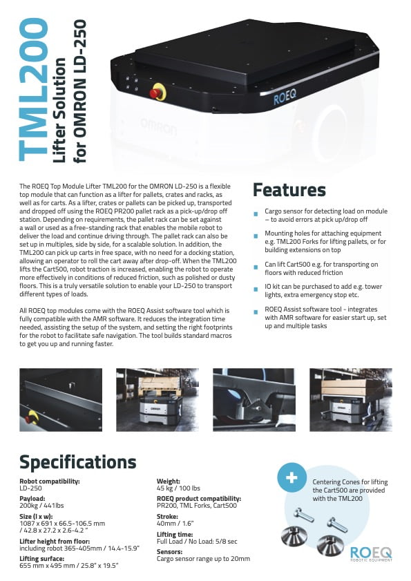 Choose from the ROEQ TML500 EU Pallet Lift solution for handling euro pallets and the flat lifter TML500 US solution for safe, reliable, pick-up transfer delivery of US pallets or other cargo.